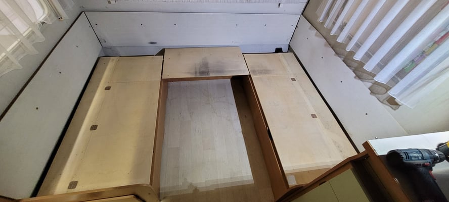 Erstmal wurde der Wohnwagen von allen losen Teilen im Inneren befreit. Eindrücklich, was bei einem leeren Wohnwagen noch alles zusammen kommt. Dank unserem Schwerlasten Regal, können wir für